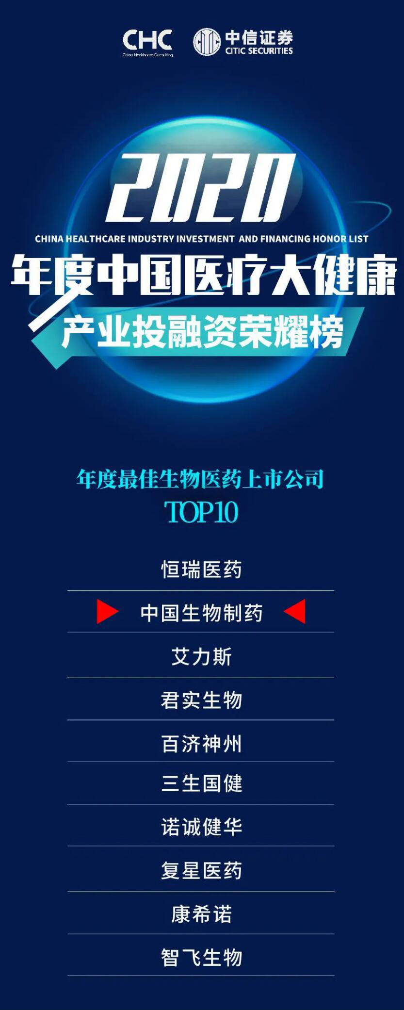 当晚,「2020年度中国医疗大健康产业投融资荣耀榜」在峰会颁奖晚宴正式揭晓。中国生物制药荣登年度最佳生物医药上市公司TOP10。