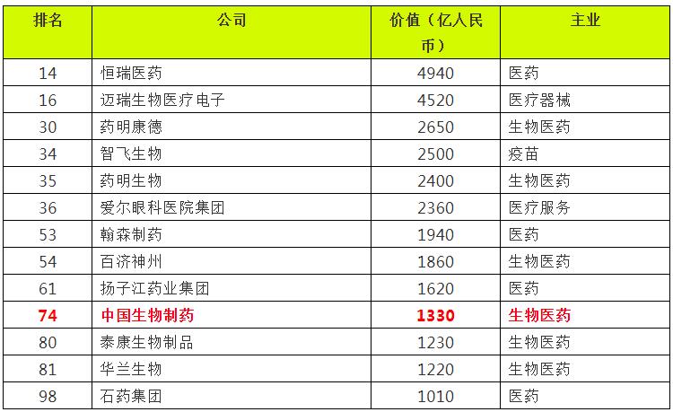 2020年11月25日,世茂海峡发展公司与胡润研究院联合发布《2020世茂海峡胡润中国500强民营企业》,中国生物制药按医药行业排名位列第10名。此排名是按照企业市值或估值进行排名。这里的“中国民营企业”是指总部在中国内地的非公有制企业。上市公司市值按照2020年10月15日的收盘价计算,非上市公司估值参考同行业上市公司进行估算。市值波动较大和排名靠前的上市公司市值在发布前有部分调整。