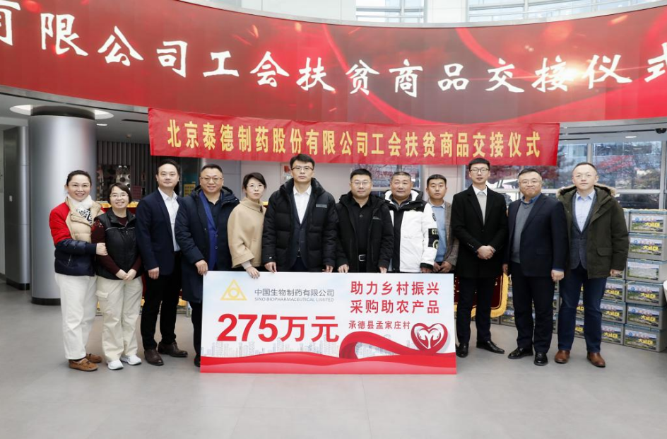 12月27日,中国生物制药集团有限公司携成员企业北京泰德制药有限公司、正大天晴药业集团、正大制药(青岛)有限公司在京举办“助力乡村振兴 采购助农产品”扶贫助农活动,共同与河北省承德市承德县刘杖子乡孟家庄村签订价值达275万元的商品采购协议。