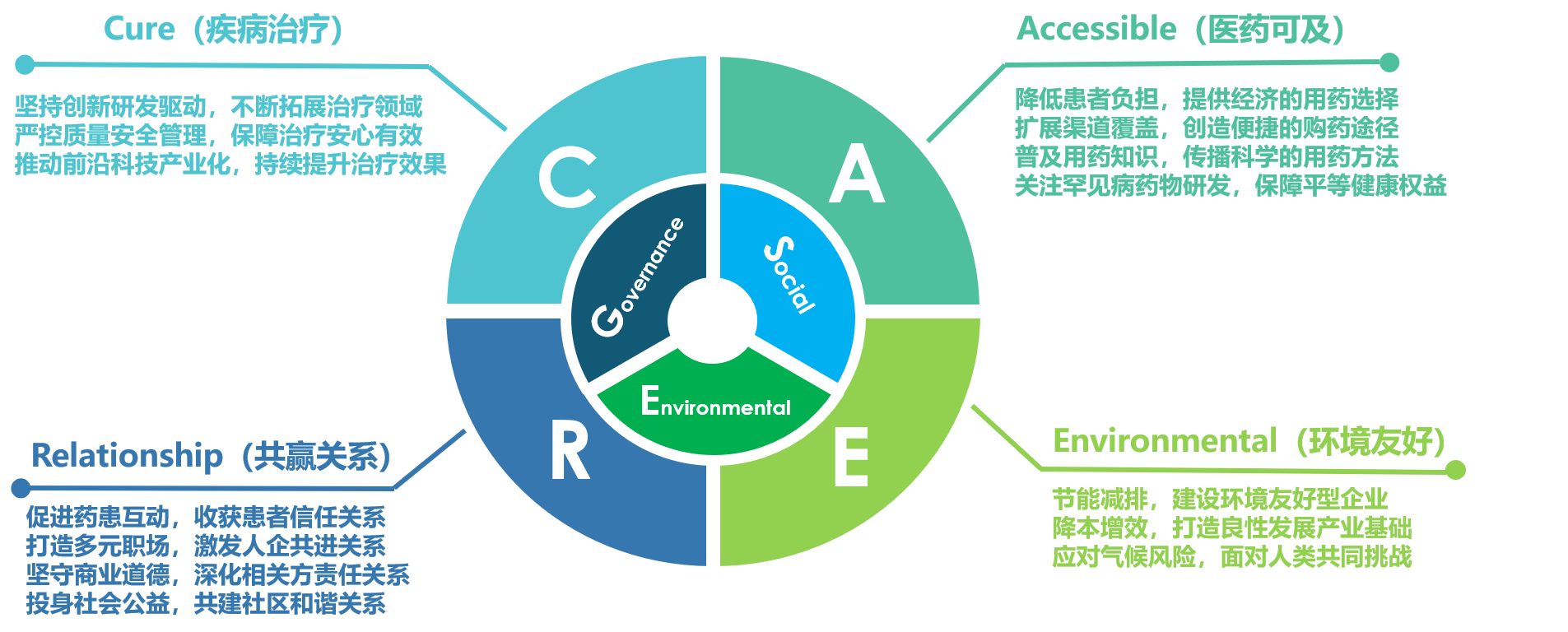 为保证九游会老哥俱乐部ESG愿景的达成,集团制定了以“CARE”为基础的ESG治理策略,以“疾病治疗,医药可及,环境友好,共赢关系”为四大核心方向,促进ESG愿景与发展战略的有机融合,推动集团业务的高质量、可持续发展。