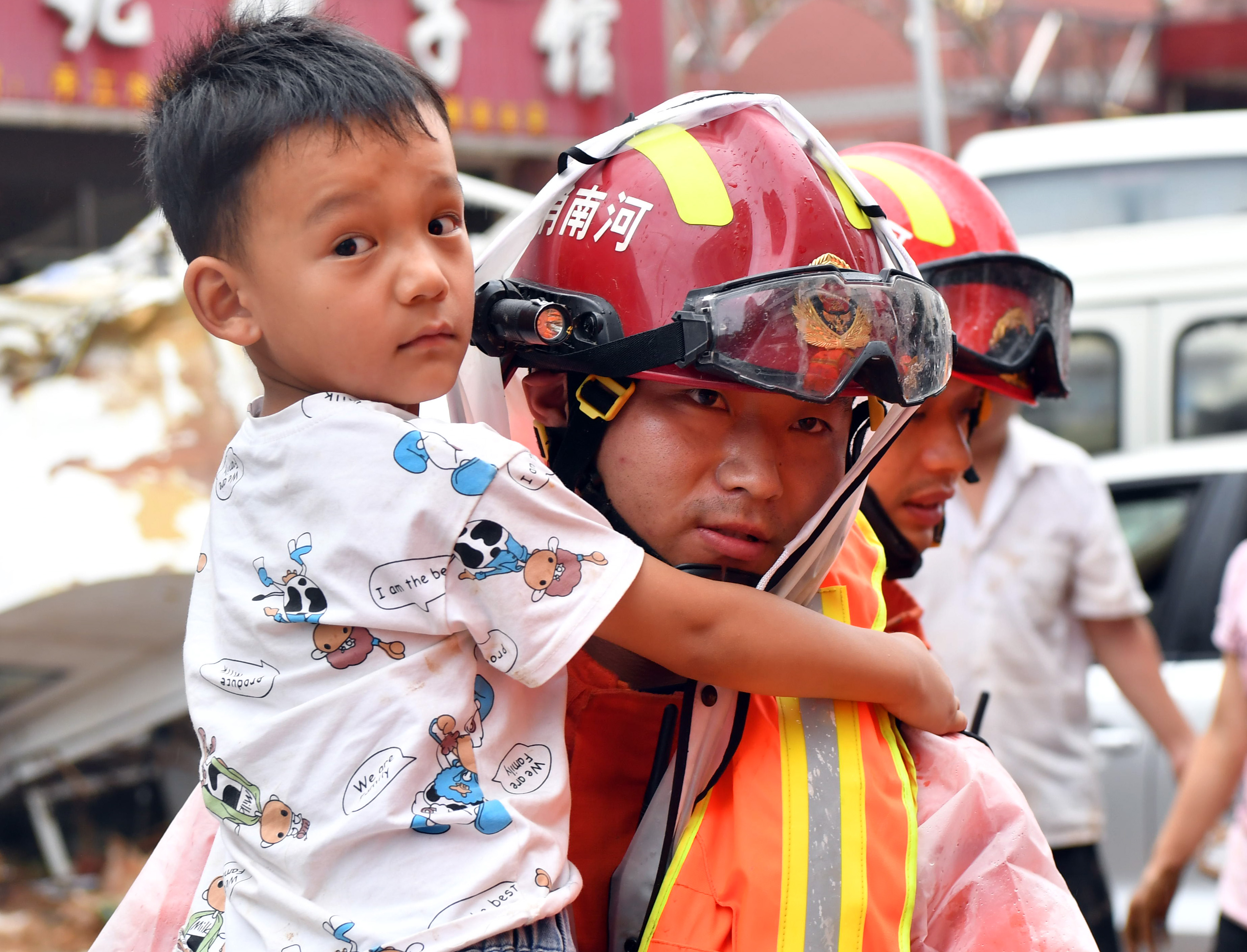 在河南省鞏義市米河鎮,消防救援人員幫助群眾轉移。(新華社)